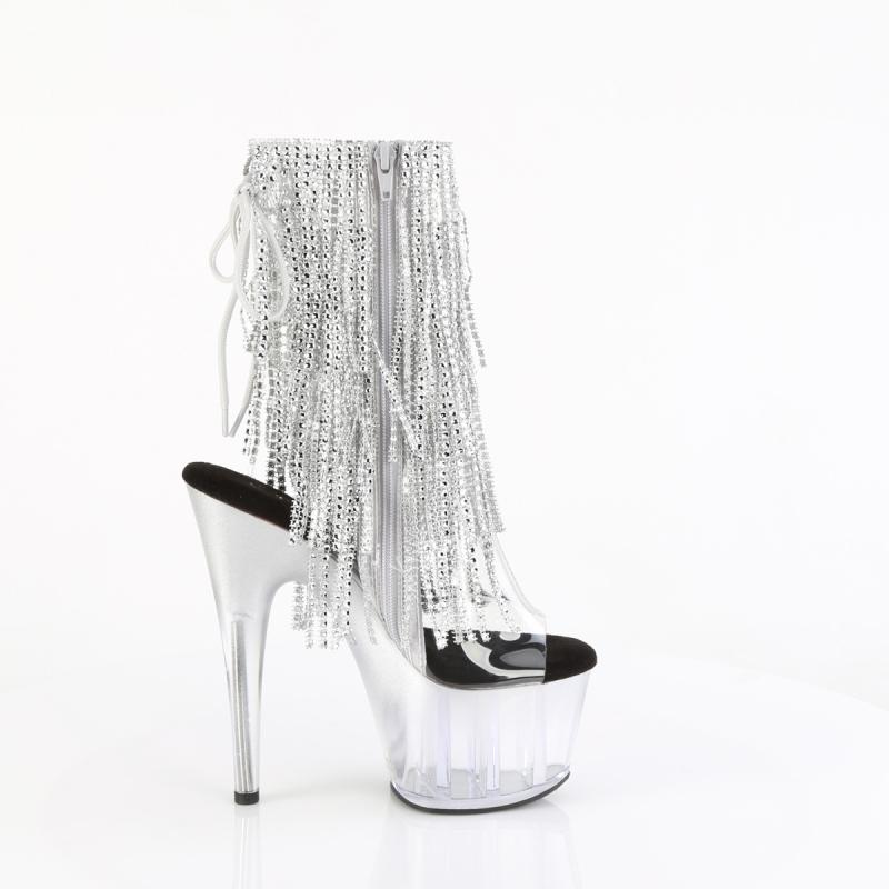 Cette splendide bottine argentée cristaux cascadants affirmera parfaitement votre style. Concevez une tenue de pole dance vibrante avec un crop top asymétrique et un short brillant de couleur noire afin de sublimer votre silhouette avec éclat. Pour des soirées inoubliables, mariez cette bottine à plateforme haut talon à un bustier à sequins et une jupe courte blanche plissée transformant votre silhouette de façon très glamour.