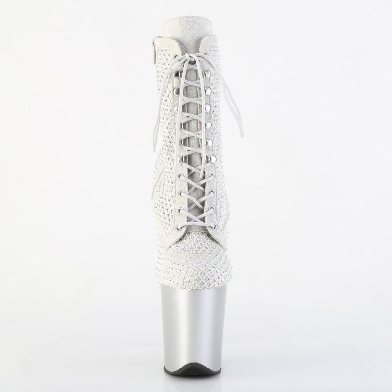 Cette magnifique bottine Pole Exotic argentée et strass à plateforme assortie pailletée de la ligne FLAMINGO est idéale pour captiver votre public lors de spectacles. Sa tige est recouverte de résille parsemée de strass ui lui procure toute son originalité.