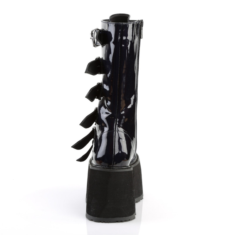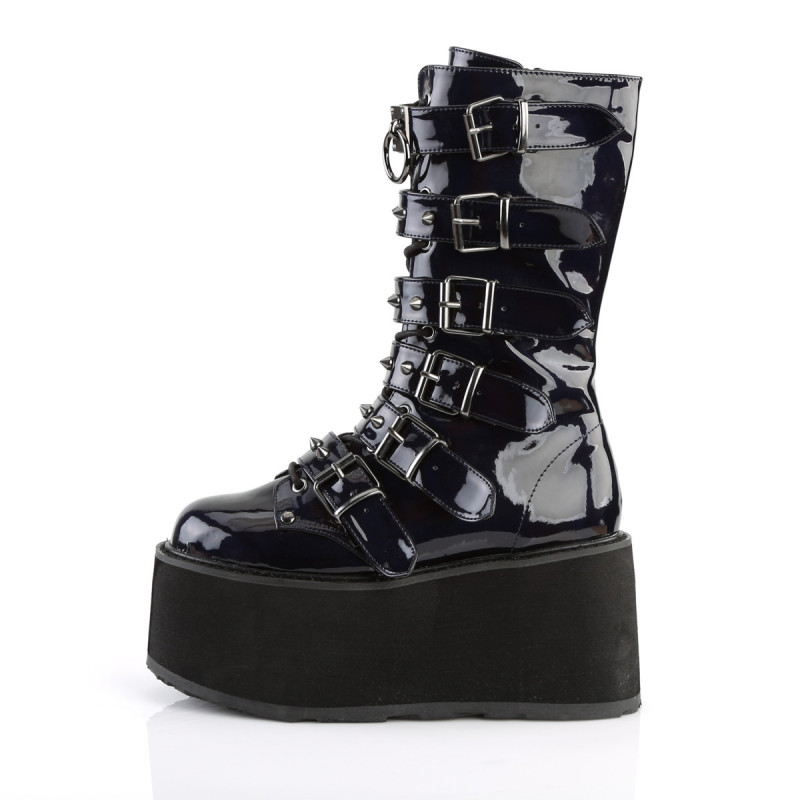 Tu veux marcher dans le futur ? Les bottes gladiateur Demonia Cult Damned-225 viennent d'une autre dimension. Avec leur plateforme massive de 9 cm en mousse haute densité, leur vernis noir holographique qui explose en reflets arc-en-ciel et leurs six sangles boucles qui courent du coup de pied au mollet, ces bottes transforment tes jambes en armure cyber. Du gladiateur qui a voyagé dans le temps.