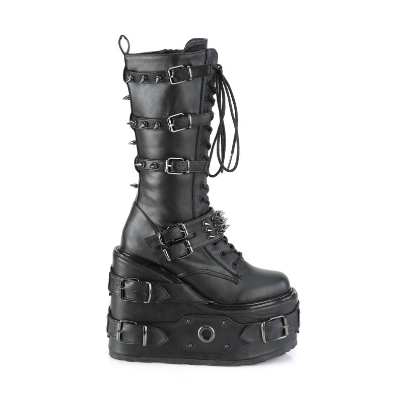Tu veux l'artillerie lourde du goth ? Les bottes plateforme wedge Demonia Cult Swing-327 sont le sommet de la game. Avec leur plateforme wedge de 14 cm entièrement blindée de sangles à pics, plaques métalliques et anneaux en O, ces bottes transforment tes jambes en œuvres d'art military-goth. Du hardware pur qui ne laisse aucune place au doute sur tes intentions.