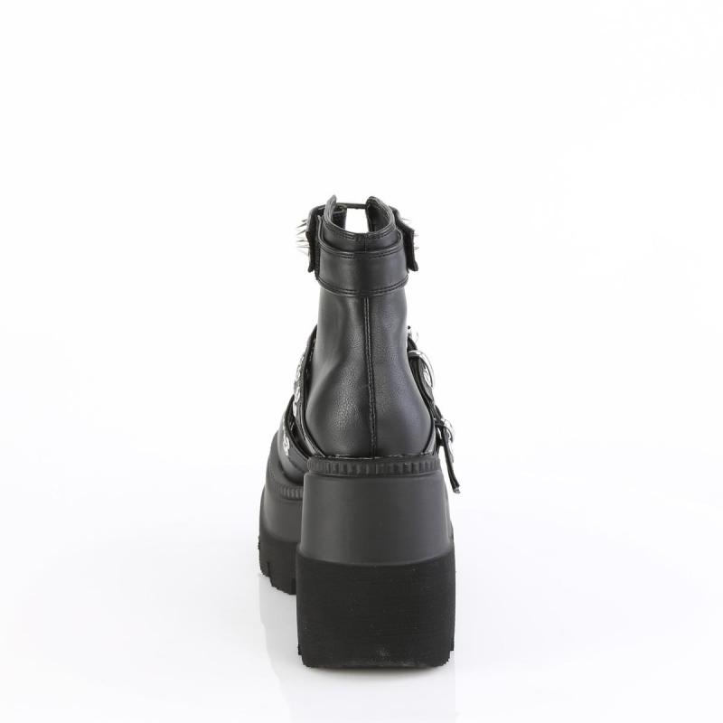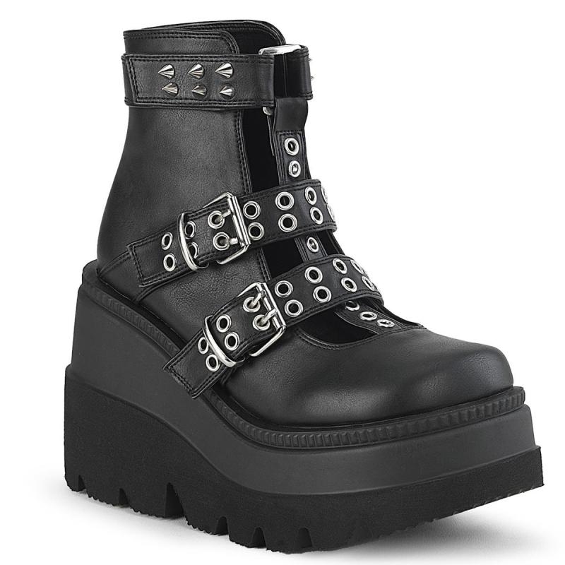 Prête à prendre le contrôle ? Les bottines wedge Demonia Cult Shaker-62 incarnent la domination avec classe. Avec leur plateforme de 11 cm, leur triple système de sangles à œillets et leur sangle supérieure ornée de pics coniques, ces bottines transforment tes pieds en armes de séduction radicale. Du hardware qui ne négocie jamais.