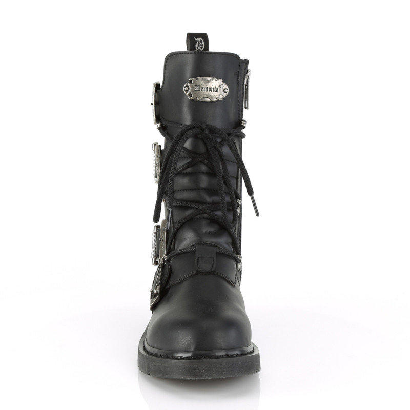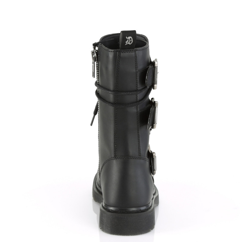 Tu veux du combat qui ne rigole pas ? Les rangers combat Demonia Cult Bolt-265 incarnent le militaire industrial sans compromis. Avec leur hauteur mi-mollet de 24 cm, leurs quatre boucles ajustables au hardware imposant qui court de la cheville au mollet et leur talon plat de 3 cm qui privilégie le confort, ces rangers transforment tes pieds en arsenal fonctionnel. Du combat qui tient ses promesses.