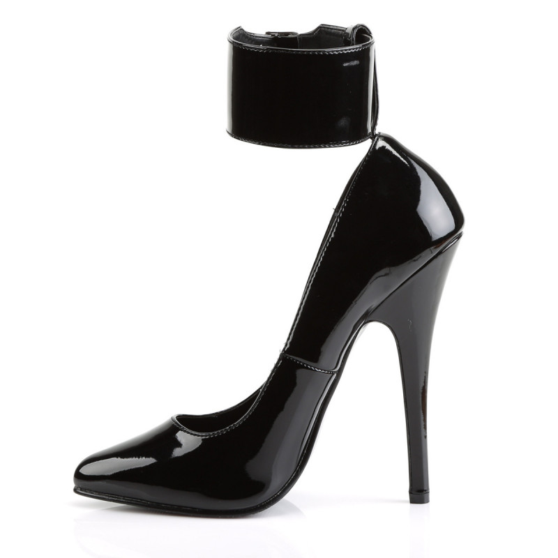 Affirmez un style audacieux avec cet escarpin noir verni à talon aiguille de 15 cm, signé Devious. Son design élancé et son large décolleté mettent la silhouette en valeur avec une intensité assumée.